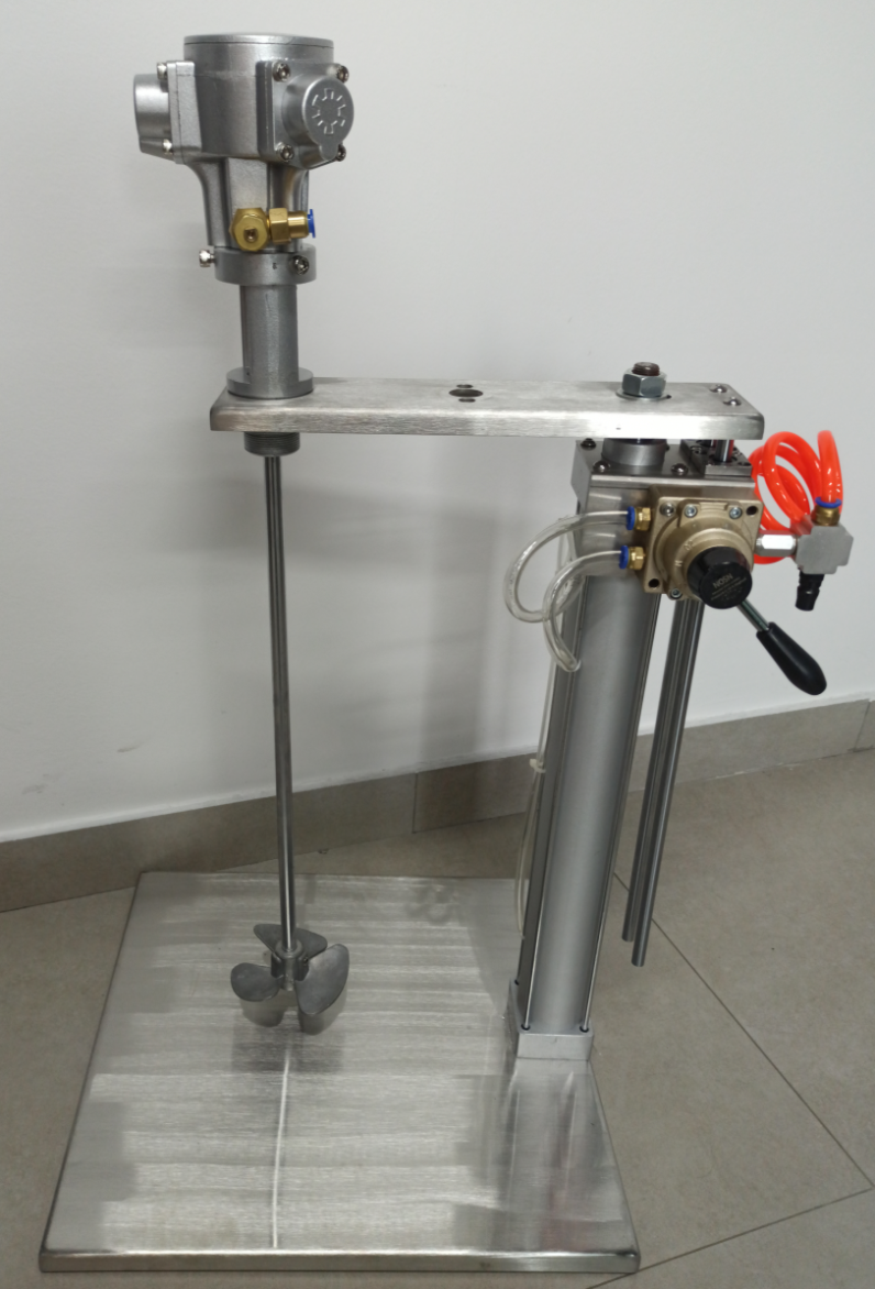 Устройство позволяет перемешивать различные виды красок и растворителей в том числе пожароопасных. Устройство спроектировано таким образом чтобы можно было перемешивать краски любых типов таких как спиртовые, водные, уф-краски с высокой плотностью, средней плотностью и низкой плотностью. Устройство также можно использовать для промешивания различных агрессивных и пожароопасных растворителей. Устройство спроектировано на базе пневматических узлов и агрегатов что позволяет безопасно использовать для легко воспламеняющихся жидкостей. В устройстве отсутствуют электрические компоненты и комплектующие. Компактно расположенные комплектующие устройства позволили снизить габаритные размеры миксера. В устройстве есть все необходимые органы управления для комфортной работы оператора. Регулятор скорости оборотов, удобный переключатель подъёма/опускания узла перемешивания.