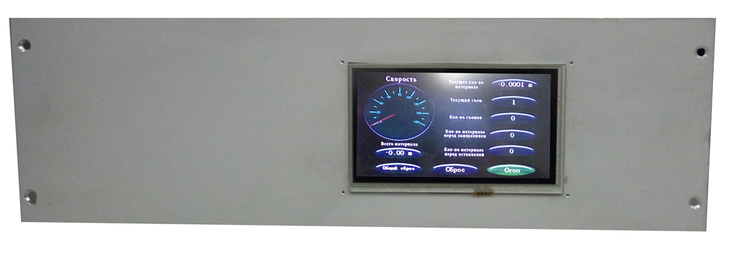 В блоке применяются современные комплектующие, сенсорный экран с разрешающей способностью 800x480 пикселей, дружественным графическим интерфейсом скомпилированным специально для работы на перемоточных машинах. Система работает с заводским энкодером счета метража, сенсором окончания полотна, сенсором пропуска этикеток.