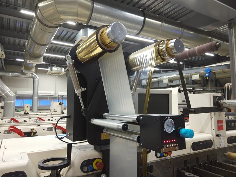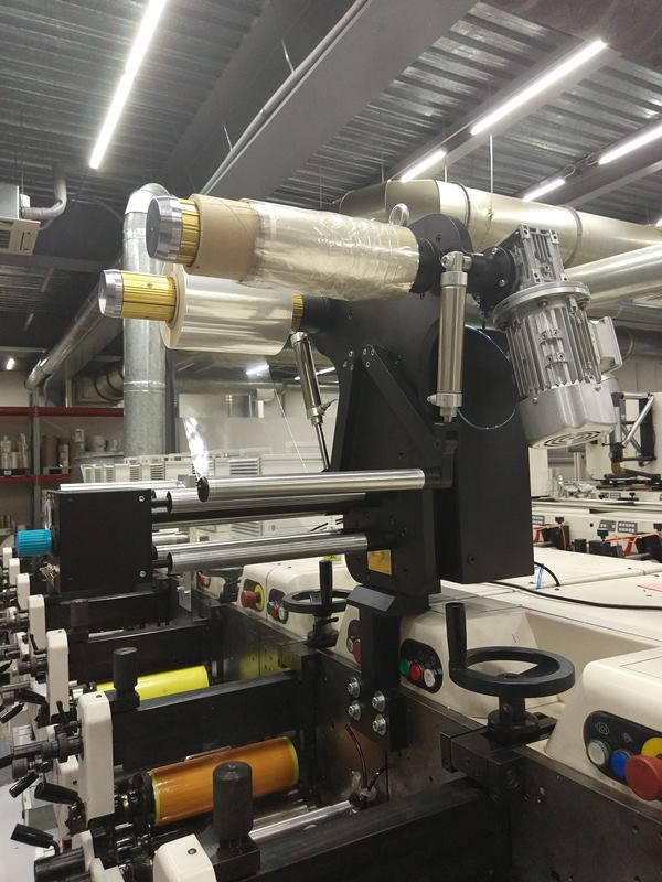 Универсальное устройство ламинирования устанавливается на любую печатную секцию узкорулонных печатных машин. Возможна интеграция в машины Nilpeter (FA — на фото, FB), Gallus EМ, MarkAndy и т. п.
